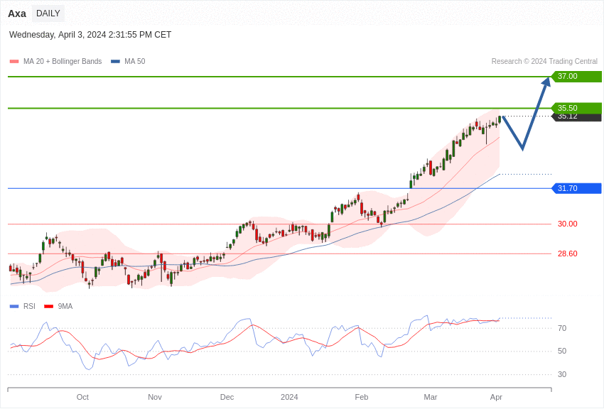 La configuration de l’action Axa est positive tant qu’elle se maintient au-dessus de 31,70 euros.