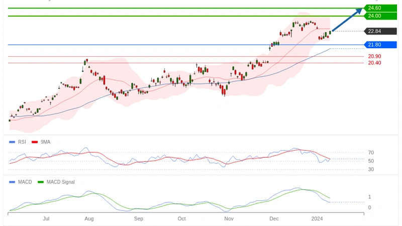 La tendance graphique de l’action Stellantis est positive tant qu’elle évolue au dessus du seuil des 21,80 euros. Le titre de la foncière peut poursuive sa hausse en direction de 24 voire 24,60 euros.
