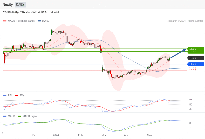 Si elle se maintient au-dessus de cette valeur, elle pourrait monter à 13,40 euros. Une résistance se situe à 13,90 euros.