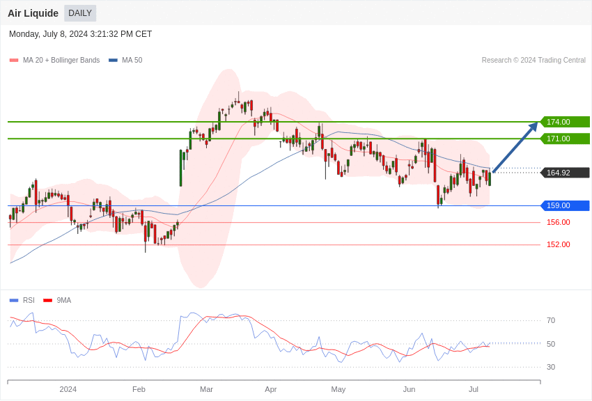 Le titre du groupe français Air Liquide est bien orienté tant qu’il évolue au-dessus du support de 159 euros.