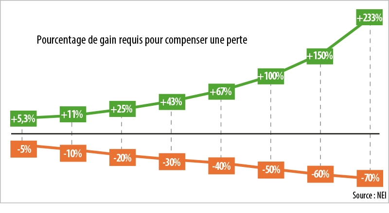 Ce que montre le graphique : si la Bourse perd 10%, vous avez besoin de gagner 10% pour retrouver votre investissement de départ, exact ? Pas vraiment.