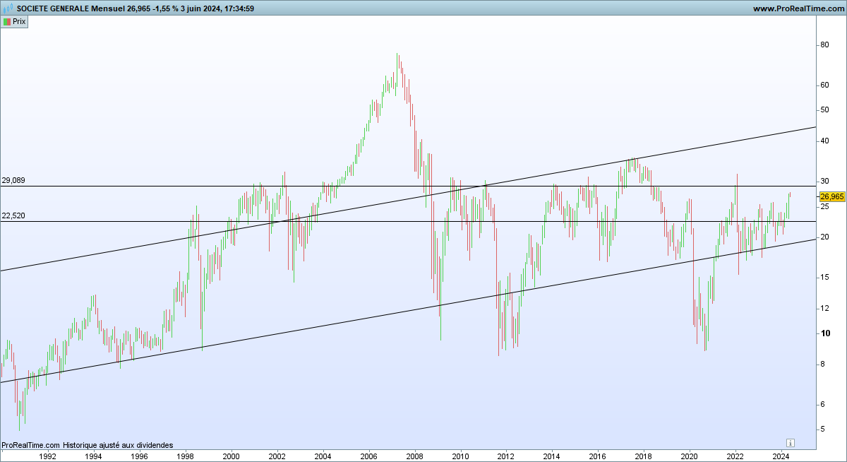 L’action a progressé de 27% depuis un an et de 23% en cinq ans, mais elle a reculé de 28% en dix ans (hors dividendes). Soit un parcours beaucoup moins favorable que celui de BNP Paribas (+32% en dix ans hors dividendes) et du Crédit Agricole (+40% en dix ans hors dividendes).